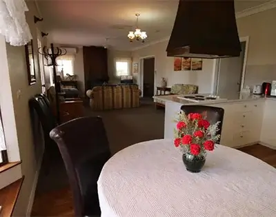 Daisy Cottage is a large fully self contained cottage with two separate queen bedrooms and two bathrooms, large living area (with room for additional beds if required), pot belly fireplace, large kitchen/dining area, laundry and large verandah overlooking farm paddocks and rolling hills, plus wheelchair access and ambulant bathroom.
